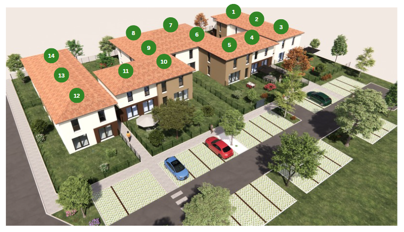 Au calme avec vue, nous vous proposons 14 pavillons T4 DUPLEX disposant chacun d’un jardin privatif avec terrasse et 2 places de stationnement.